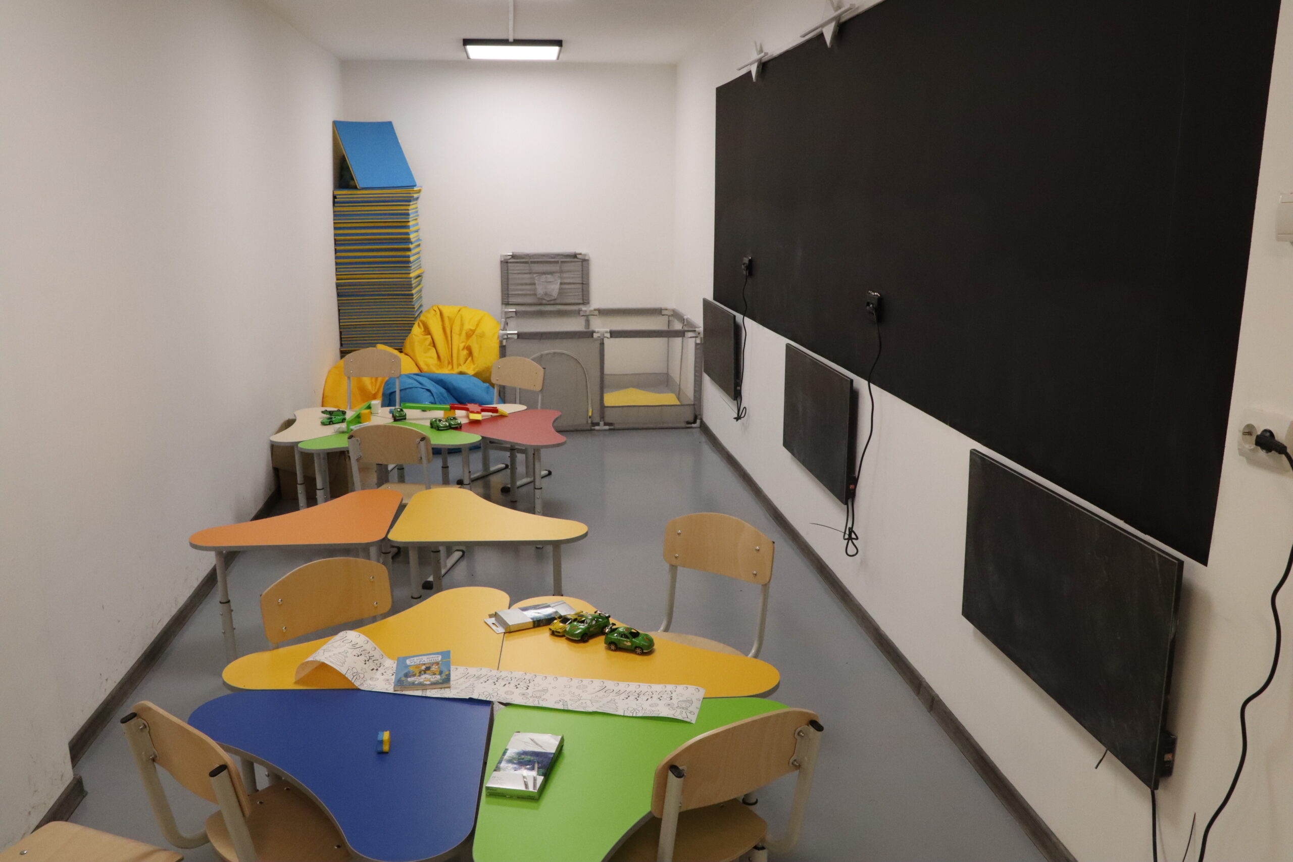 Гуманітарна організація зробила зонування простору для різних вікових категорій, для навчання та відпочинку. Є окрема територія для вихованців садочка. Підлога там облицьована лінолеумом. Малеча також має можливість спати в окремій кімнаті. Вона розташована в окремому крилі, аби вихованцям садочка не заважав шум від старших дітей. Є стільці зі спинками для зручного сидіння. Є кулер з водою, аптечка, вогнегасник.