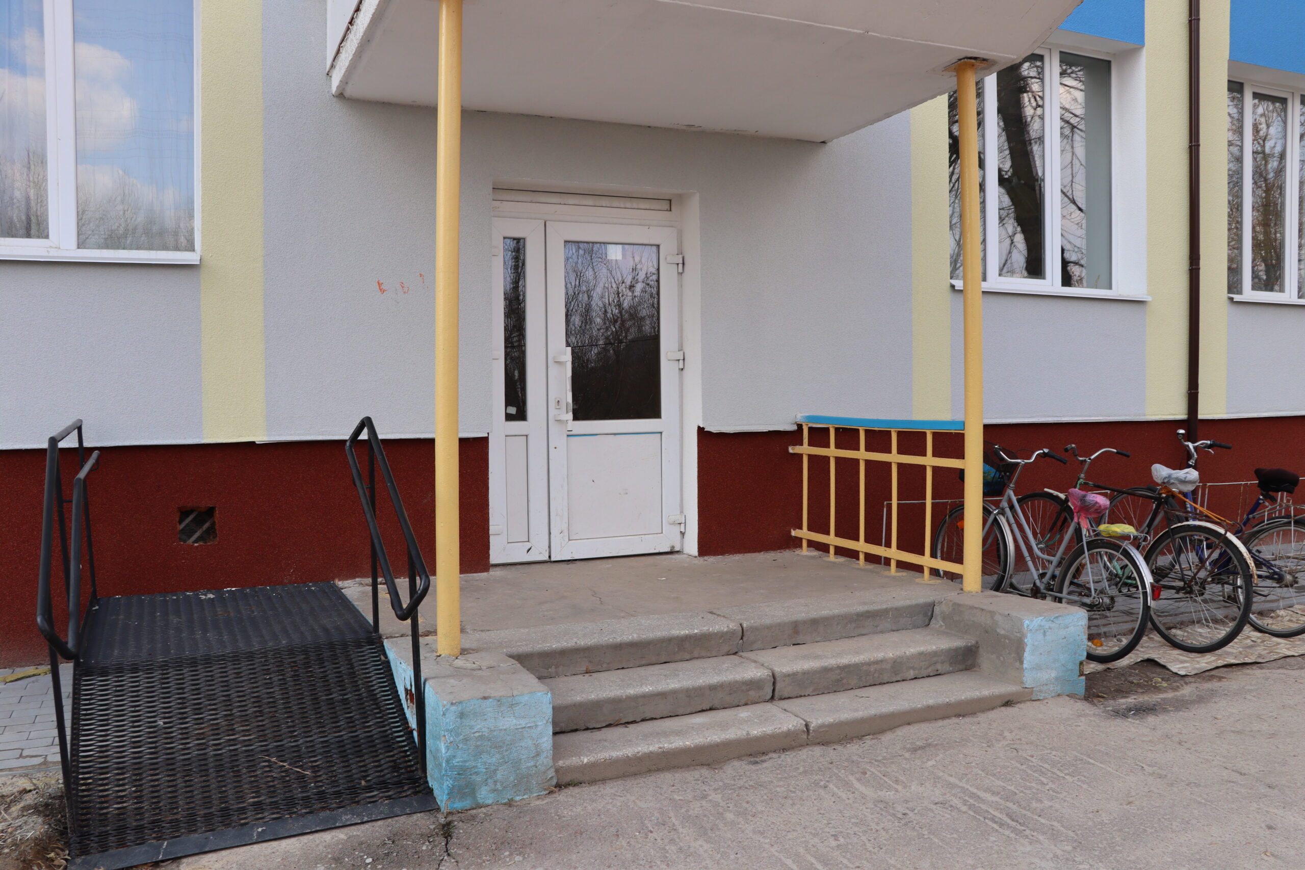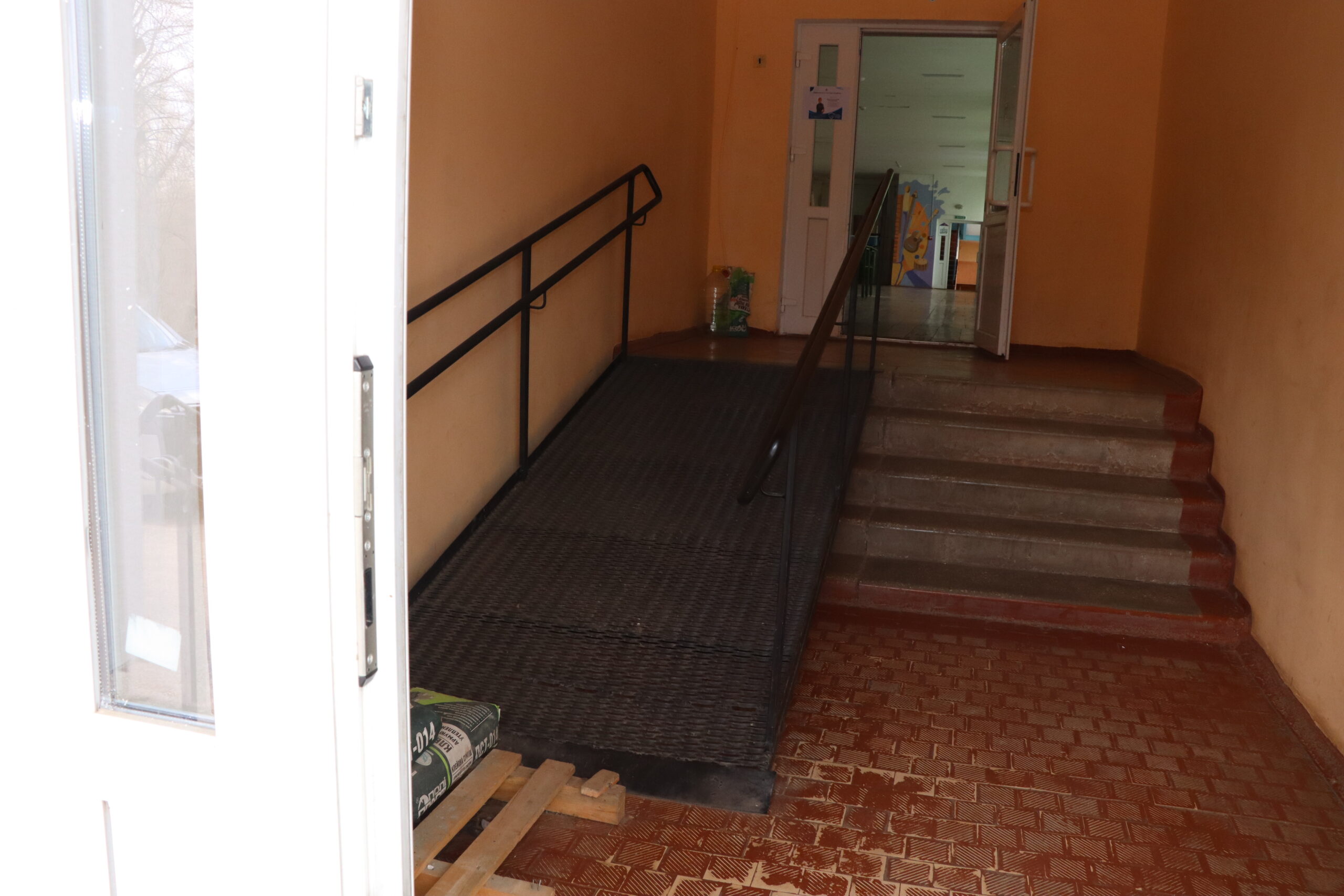 З іншої сторони будівлі пандуси на вході вже є. Перший — на вулиці, другий — в коридорі. Обидві конструкції мають поручні зліва та справа. До речі, на інших об’єктах відбудови Чернігівщини поручні з обох боків, на жаль, зустрічається не так часто.