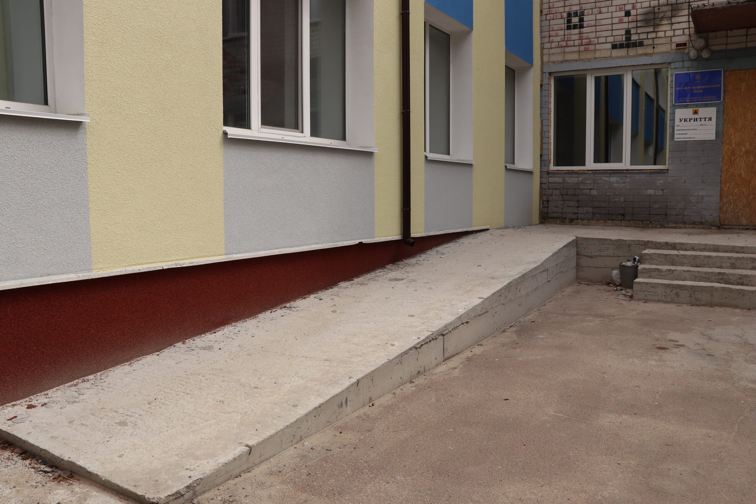 На центральному вході якраз триває облаштування бетонного пандуса з плавним кутом нахилу. Гроші на нього виділені в межах капітального ремонту Михайло-Коцюбинського ліцею.