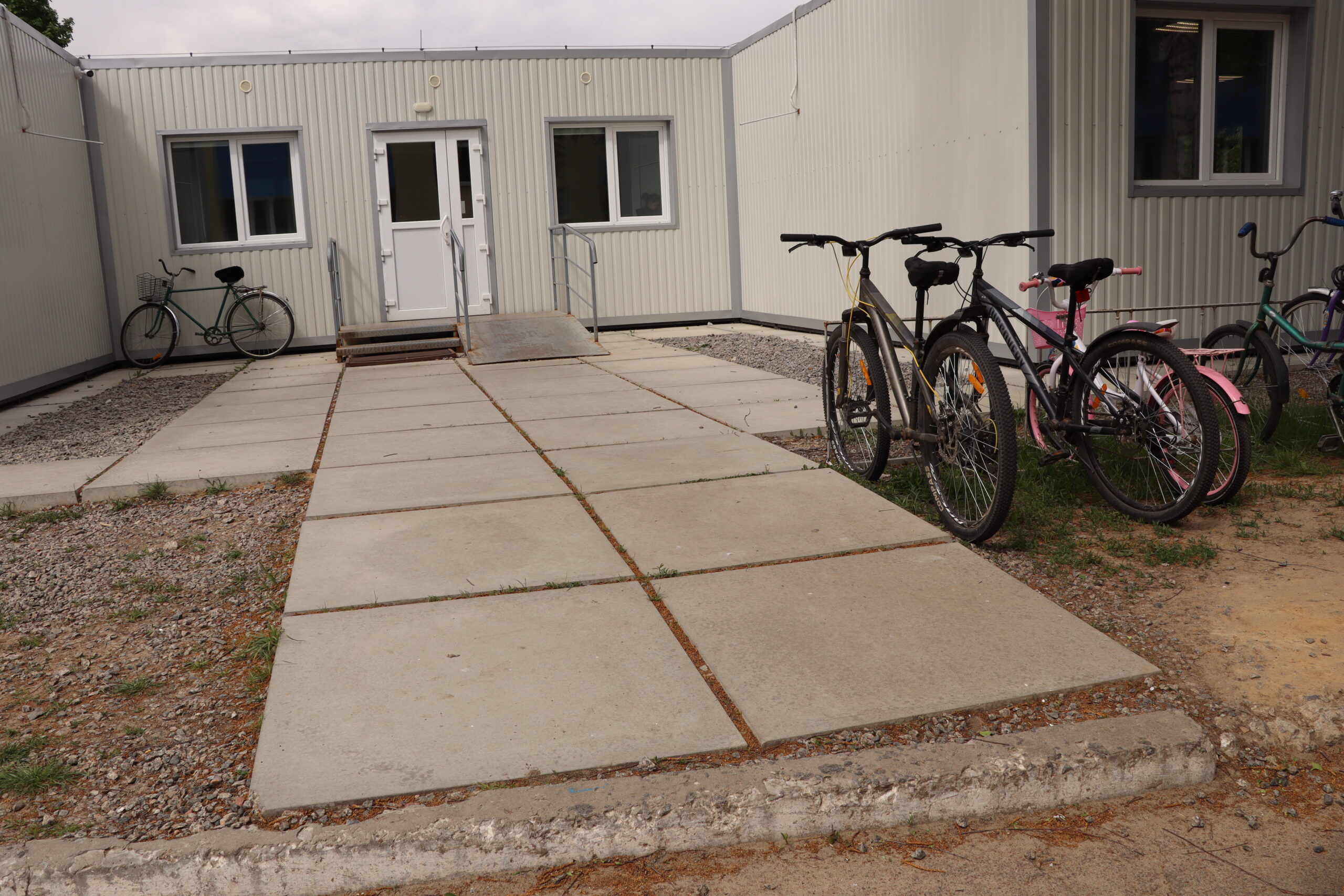 Ще один пандус облаштовано в модульному будинку на території ліцею. Його ширина 120 см, а майданчик для розвороту — 157 см, поручні на висоті 90 см. Цього розміру теж достатньо для маневрування. Утім доступ до самого пандусу дещо ускладнений, оскільки треба подолати бордюр, максимальний виступ якого складає 9 см.