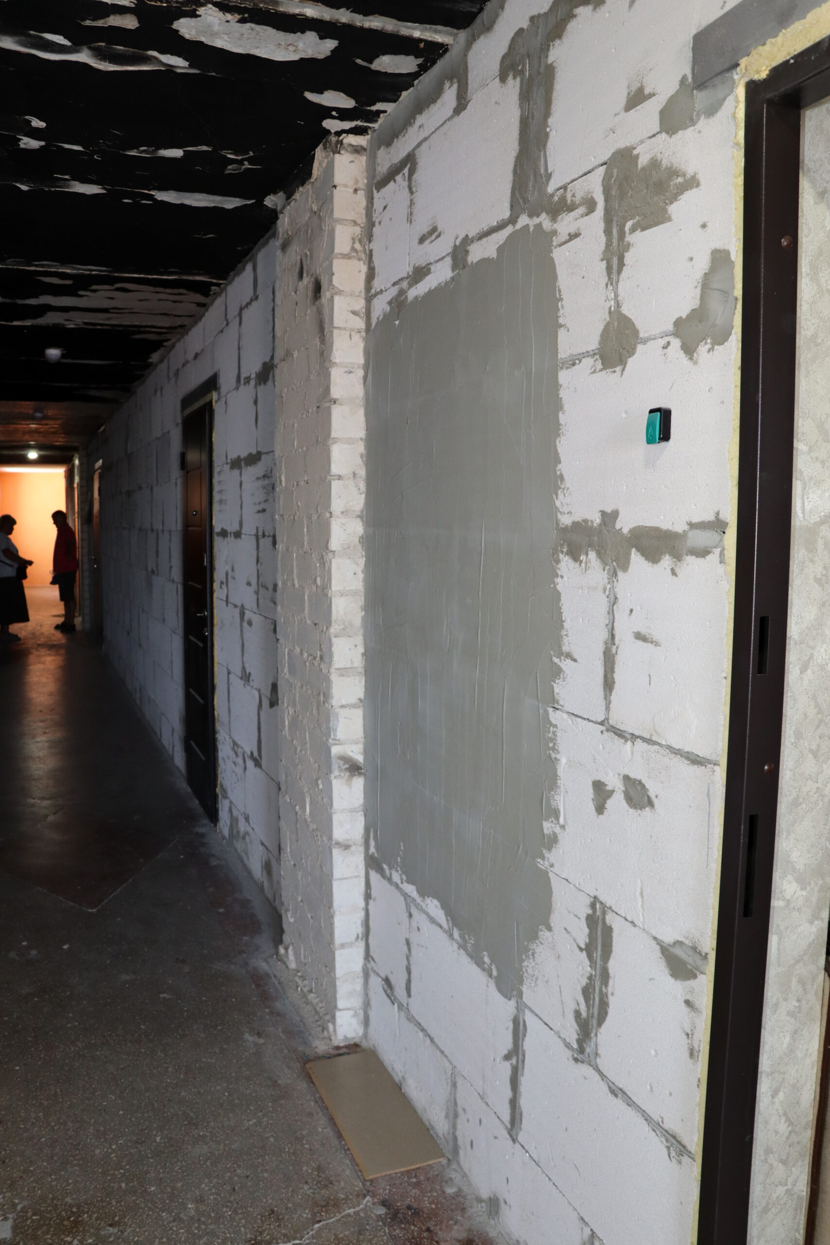 Частково облаштовані стіни на першому поверсі та біля ліфта.