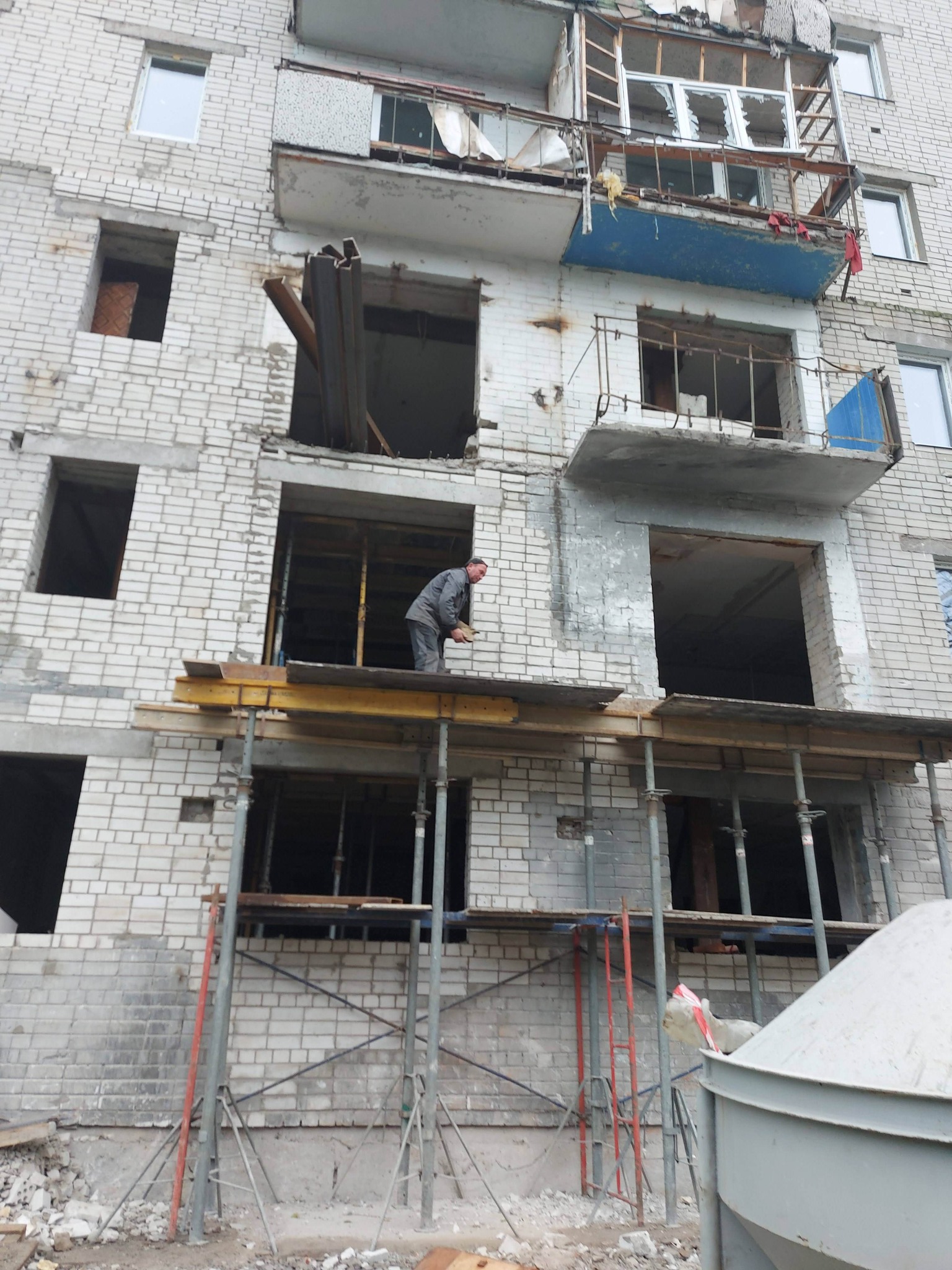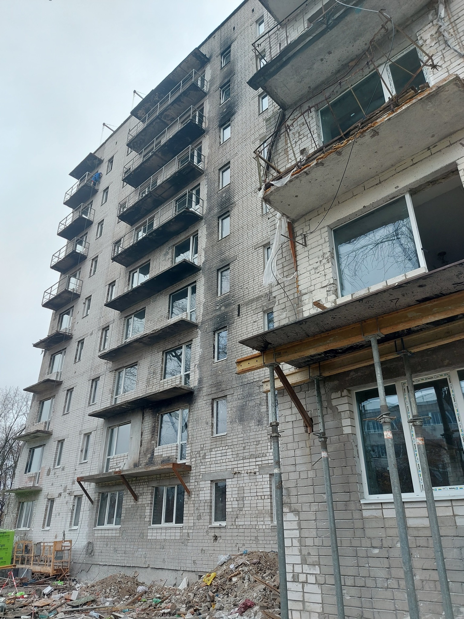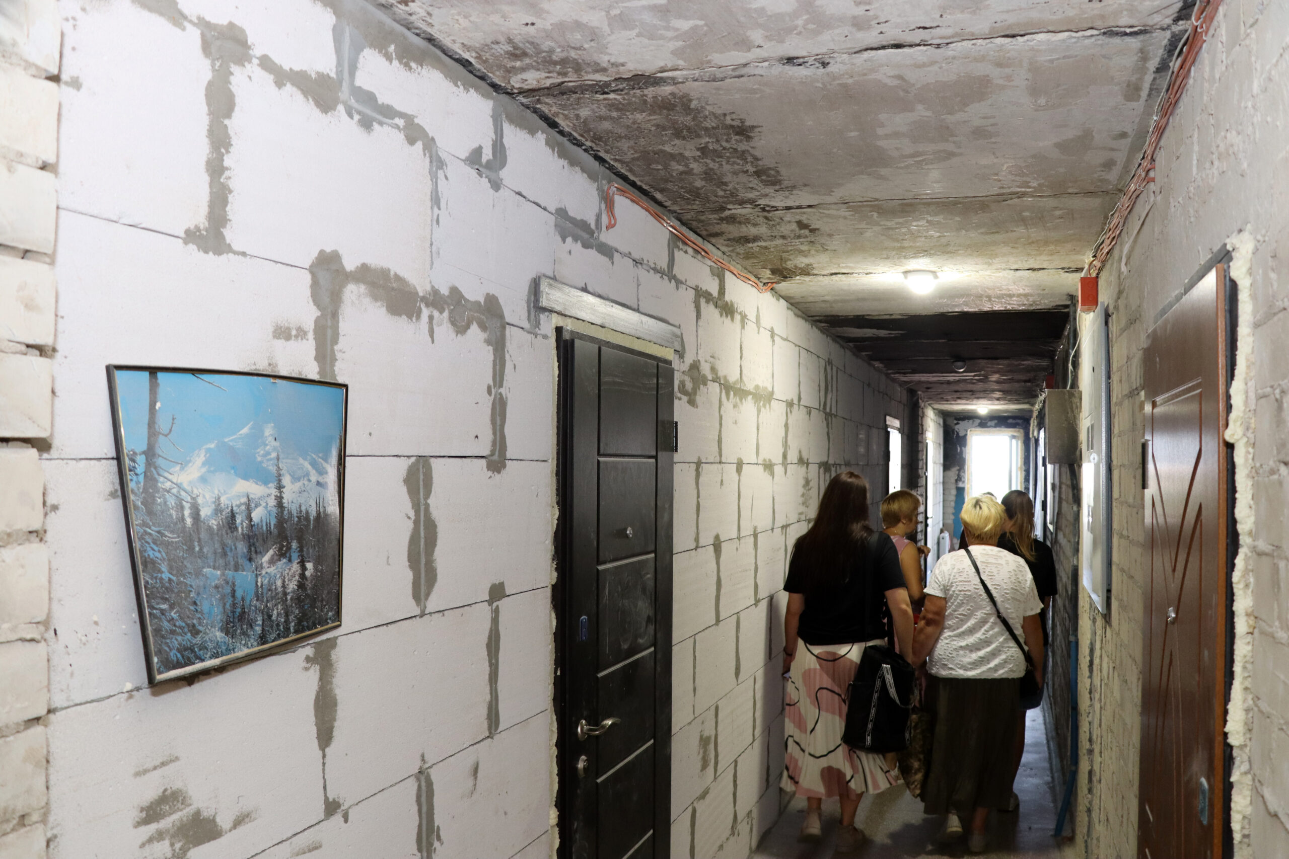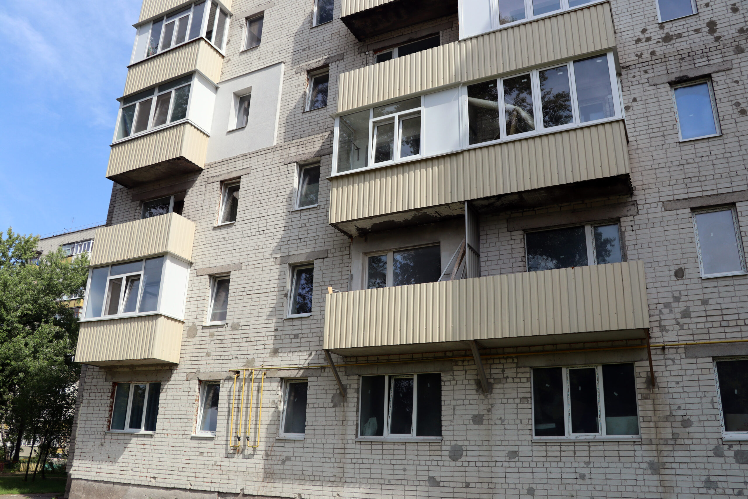 Було відновлено та підсилено цегляну кладку, облаштовано пошкоджені плити перекриття між поверхами й балконні плити, відновлено зруйновані перегородки, внутрішні коридорні стіни та впорядковано місця загального користування.
