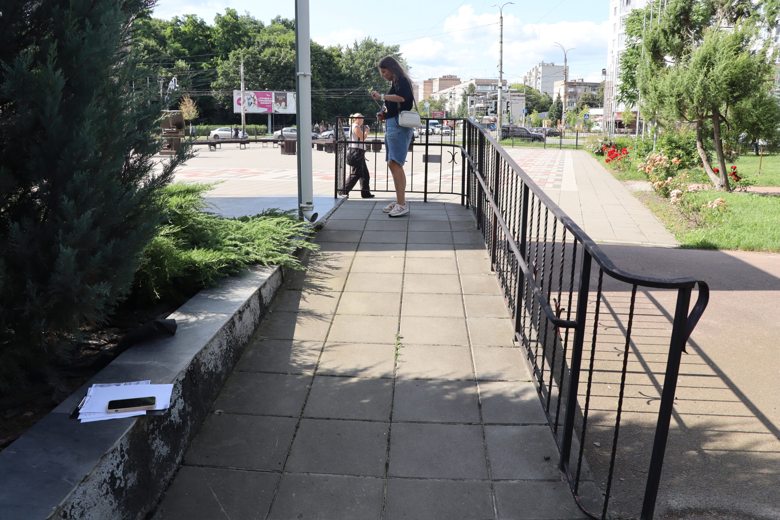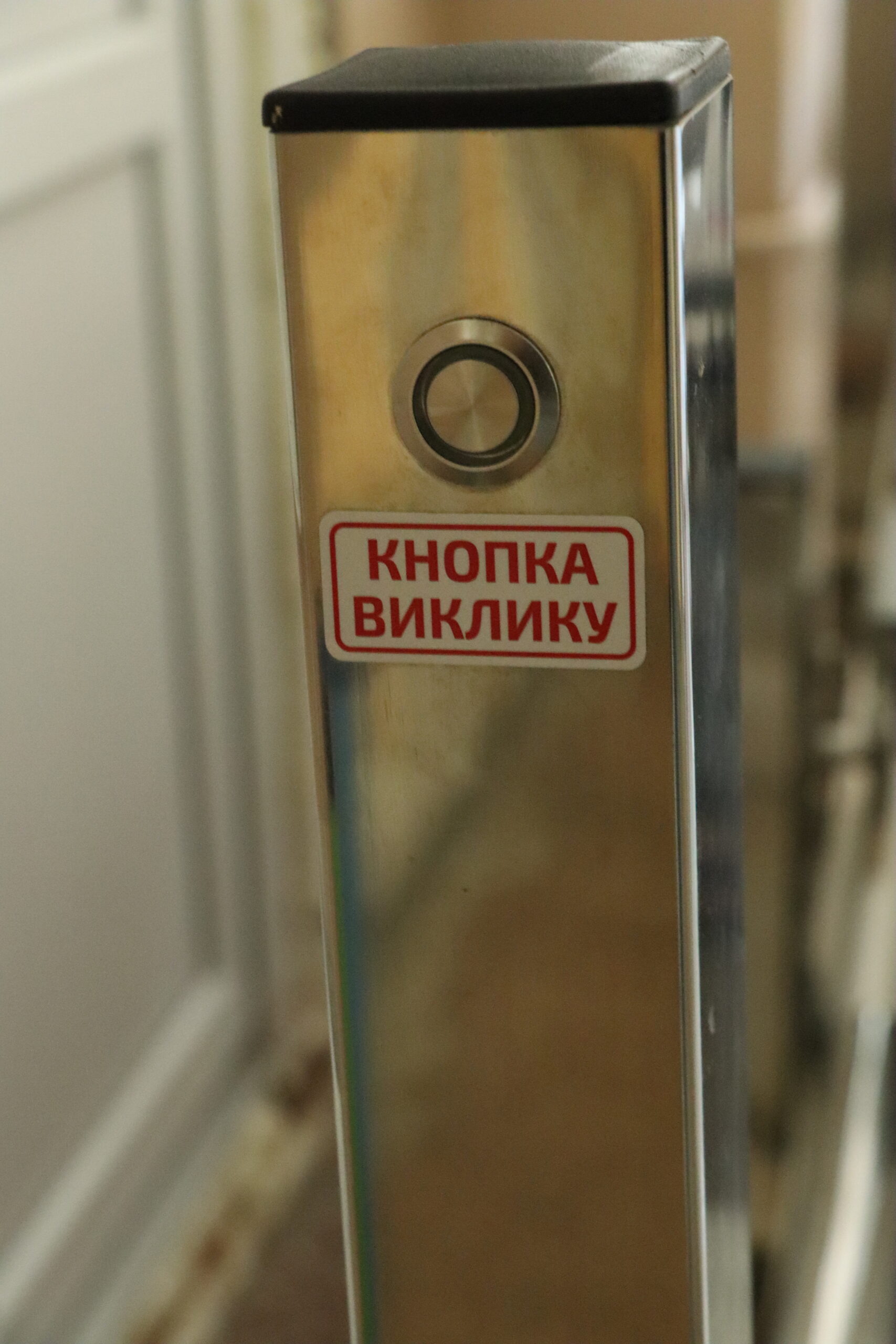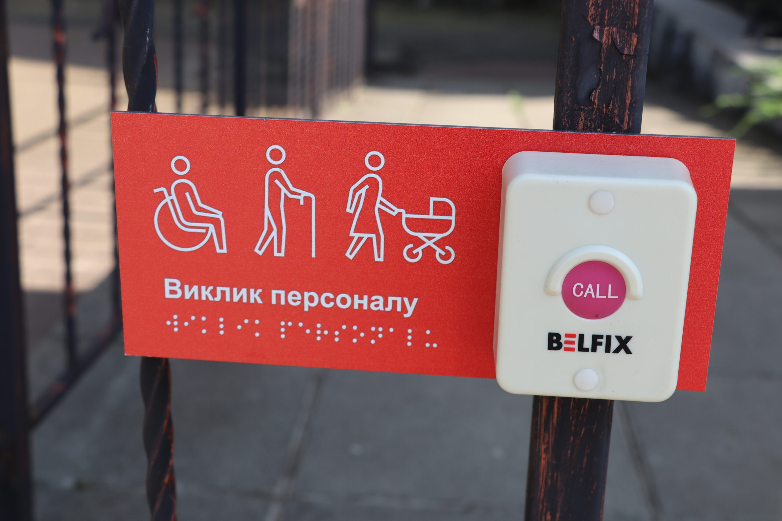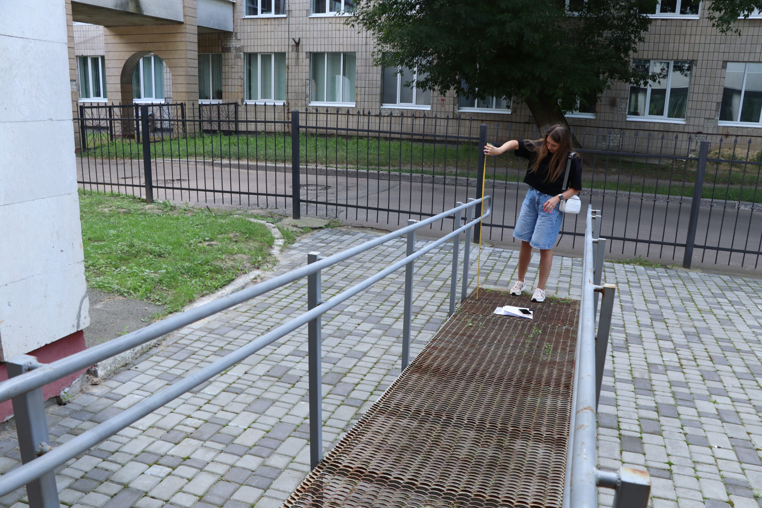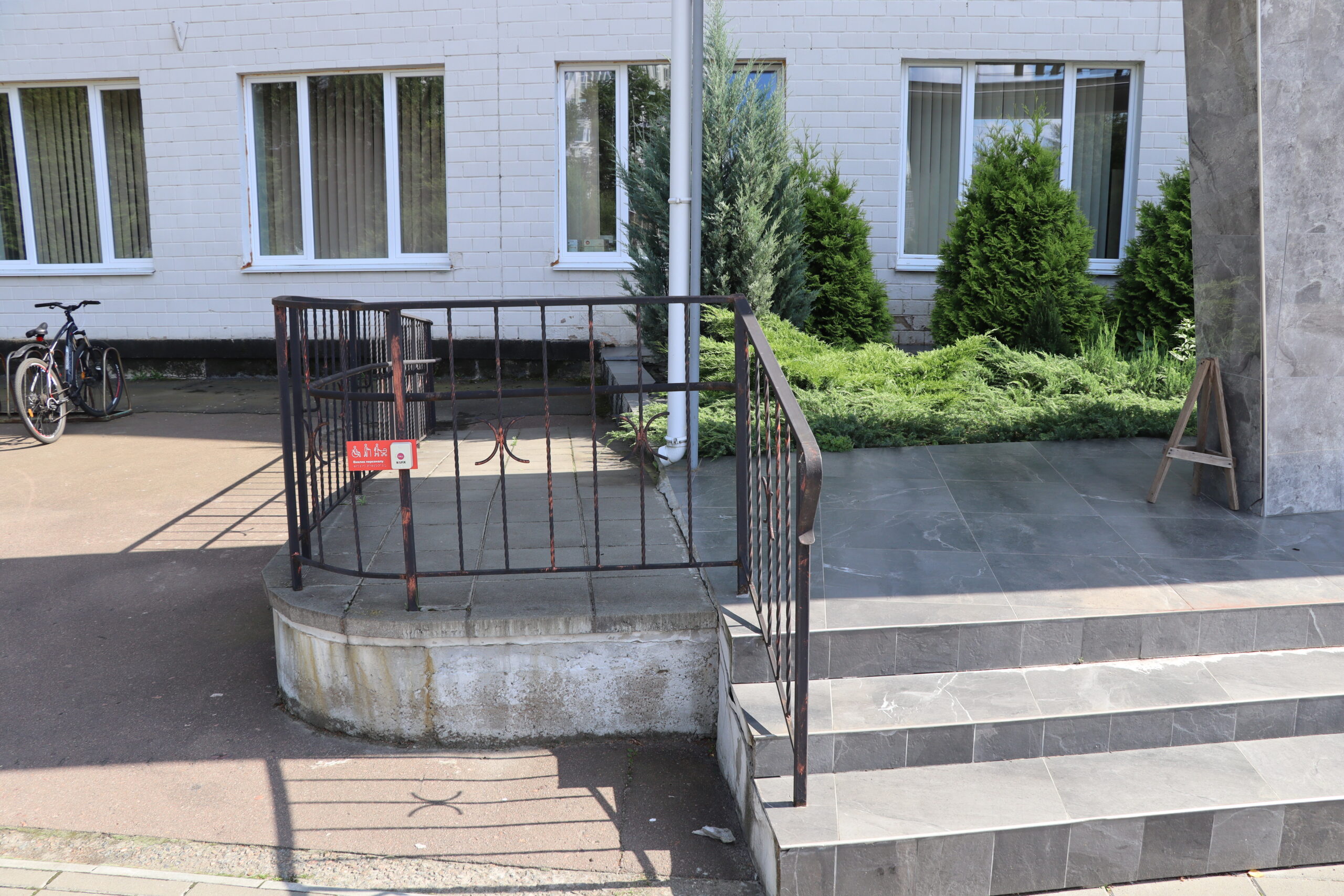 ❌ Написів шрифтом Брайля обмаль (лише дві кнопки виклику на допомогу), немає навігаційних схем із тактильними елементами. Біля заїзду на пандус біля центрального входу є вибоїна.