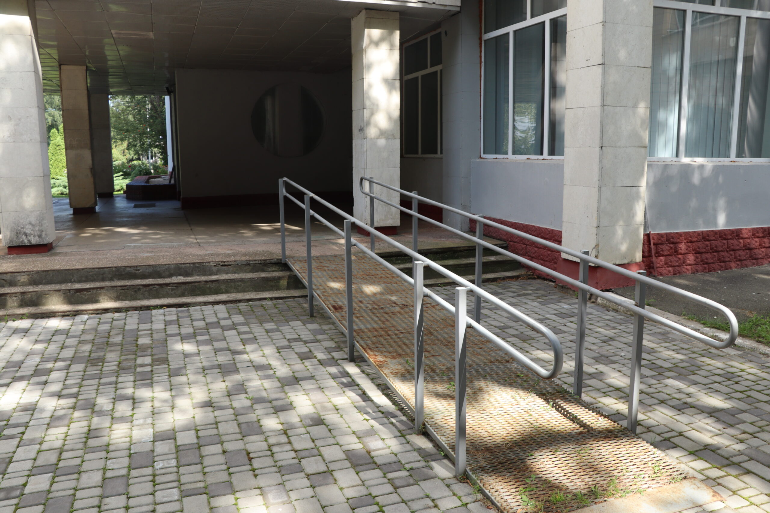 ✅ Вхід добре виділений, має навіс. Двері легко відчиняються, обладнані зручною ручкою-скобою. Пандус шириною 150 см із поручнями з обох боків, нахил плавний, поверхня не ковзка. Біля інших корпусів є залізний пандус та занижена бетонна підлога.