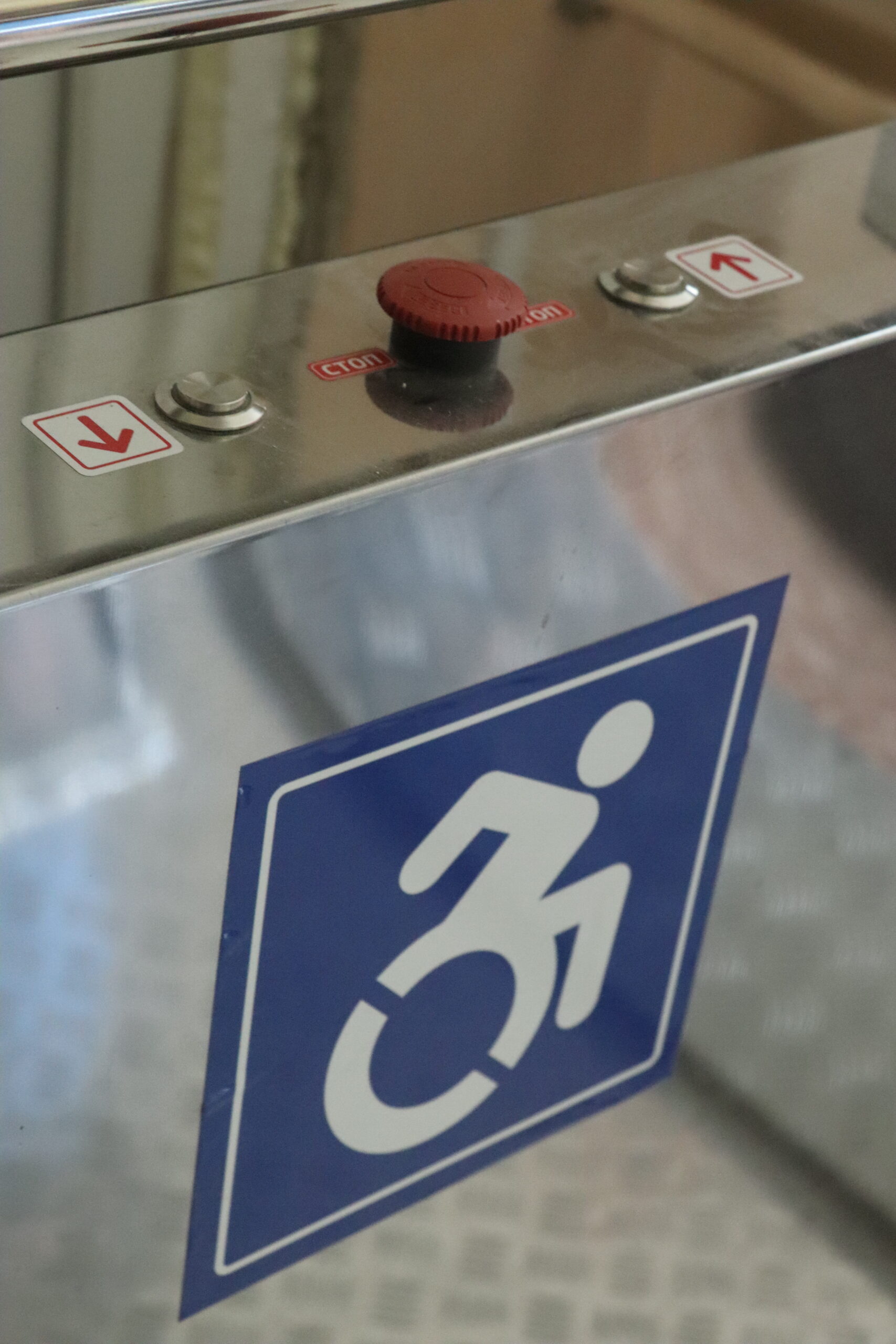 ❌ Є 3 ліфти (один вантажний, також передбачений для людей на кріслі колісному). Ширина дверей вантажного/інклюзивного ліфта складає 70 см, хоча вони мають бути понад 90 см. Кабіна усього 105 см завширшки і є замалою для зручного користування.
