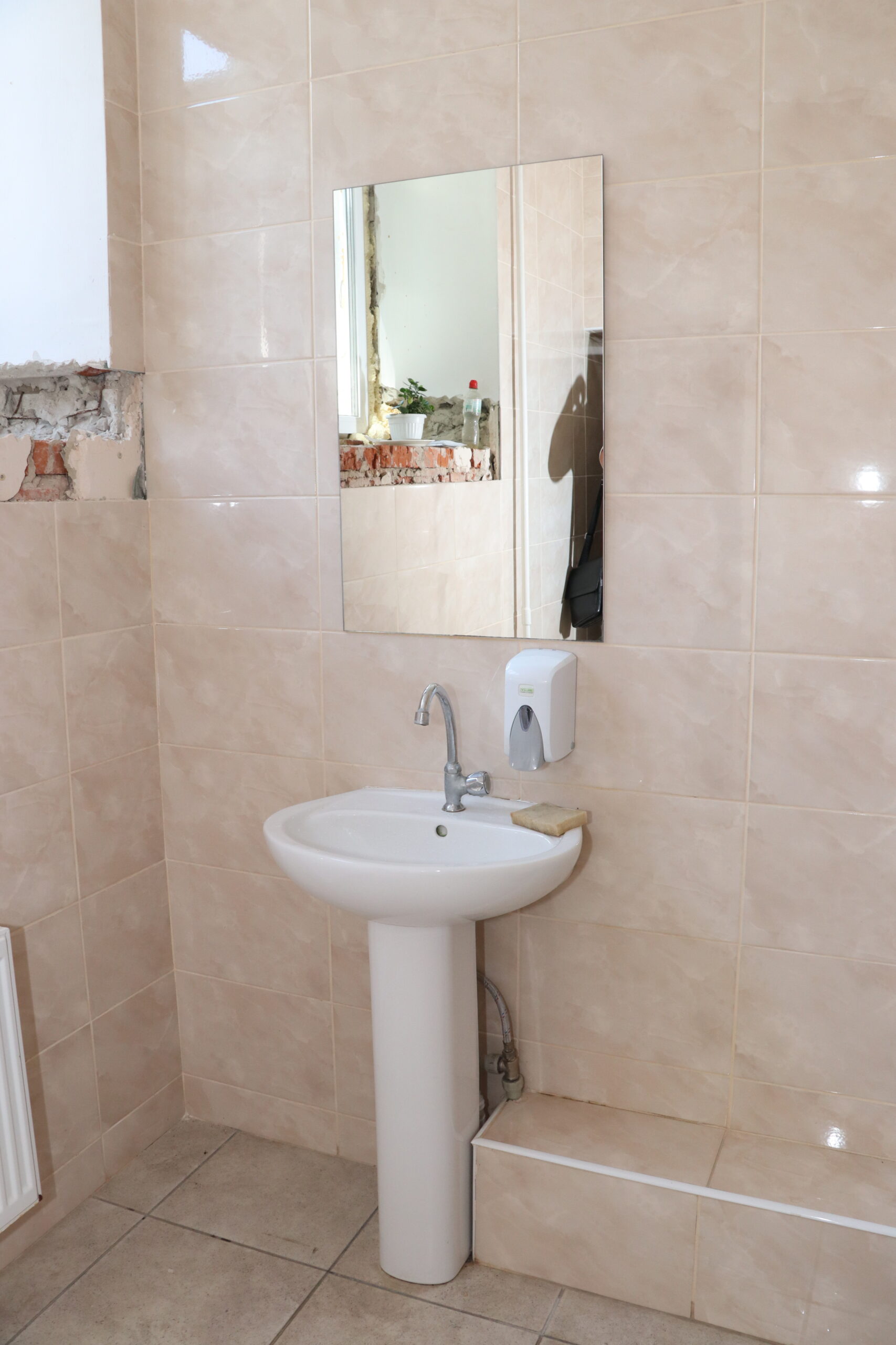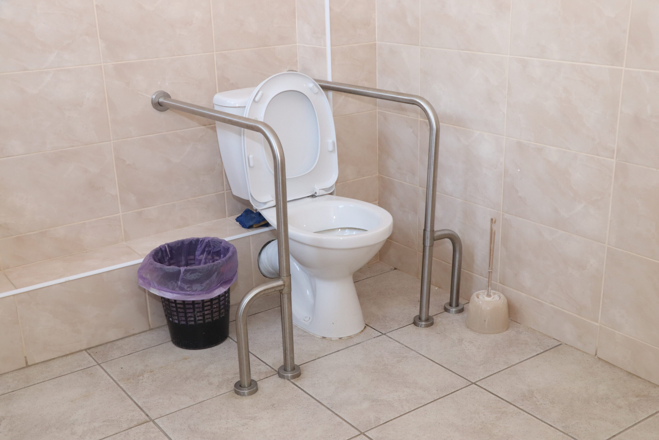 ❌ Ширина дверей лише 80 см, що створює труднощі для проходу на кріслі колісному. Поручні біля унітаза встановлені з малим проміжком між ними. Немає відкидних поручнів біля унітаза та умивальника. Під умивальником немає вільного простору. Змішувач традиційний, не важільний і без сенсорного датчика. Дзеркало не регульоване. У санітарній кімнаті немає кнопки виклику допомоги.