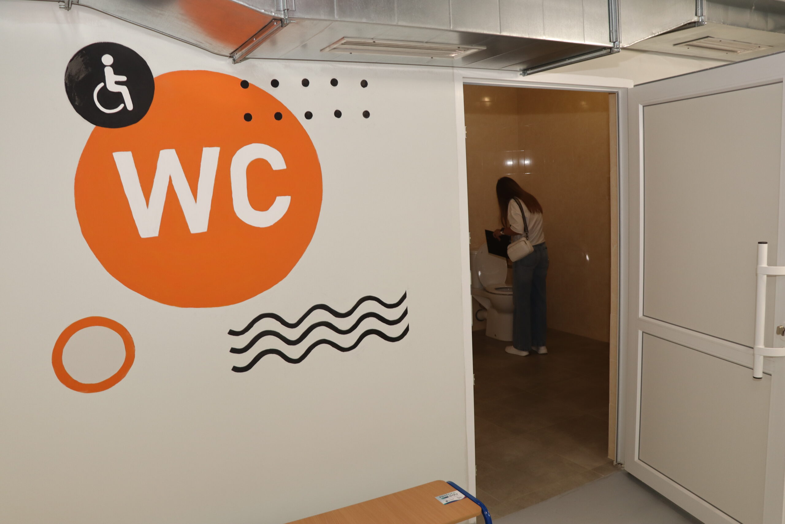 На першому поверсі є вбиральня для осіб з інвалідністю: ширина приміщення 250×260 см, дверей — 98 см, умивальники встановлено на висоті 78 см, поручні — 58 і 78 см. Також в приміщенні є інклюзивне укриття з туалетом: ширина дверей там 96 см, умивальник встановлений на висоті 84 см, поручні — 64 і 85 см з обох боків. Встановлено дзеркало з нахилом та ручкою для регулювання.